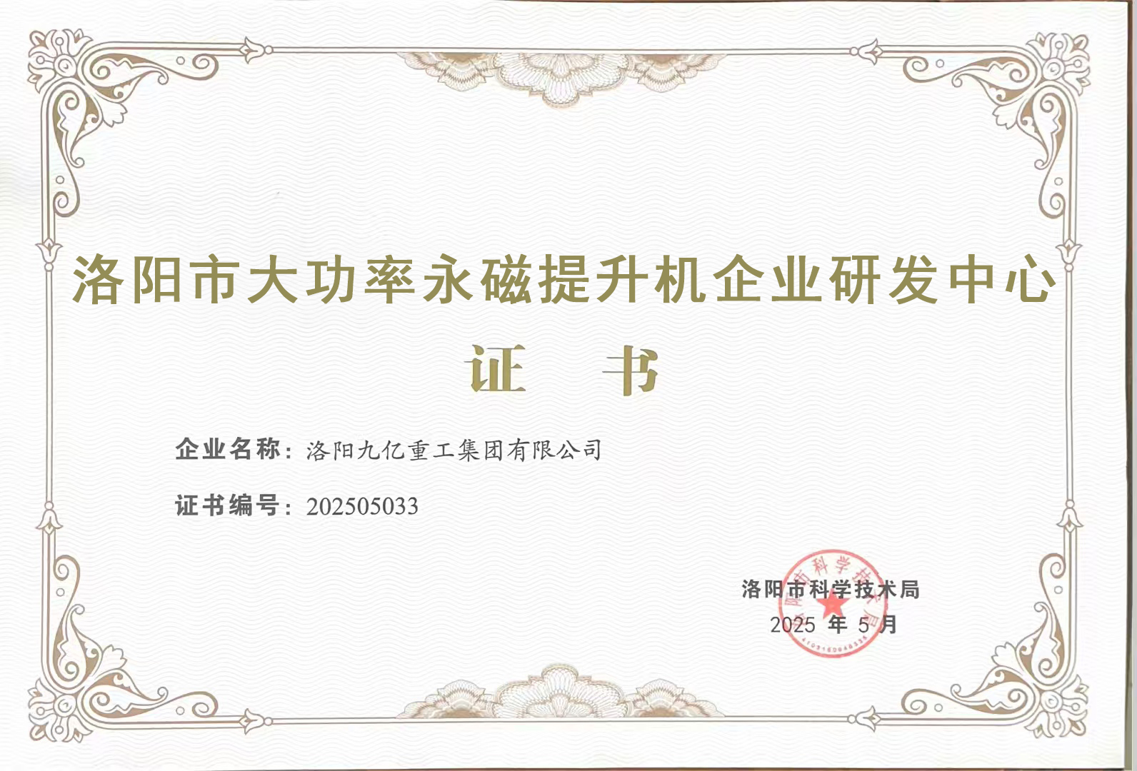 洛陽(yáng)市大功率永磁提升機企業(yè)研發(fā)中心證書(shū)